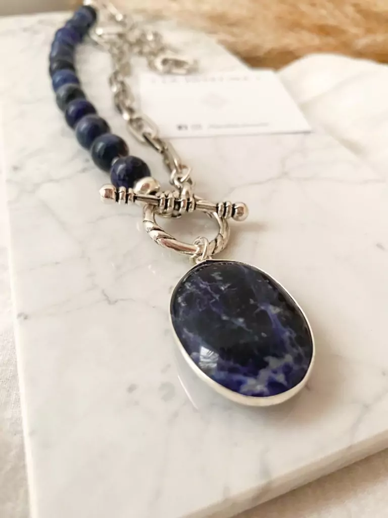 Collar con un largo de 51cm entre la cadenta y las piedras circulares. El cierre marinero (puede variar el diseño al de la foto) y la piedra colgante miden 5,5cm. Es decir que el total del collar es de 56,5cm de largo.