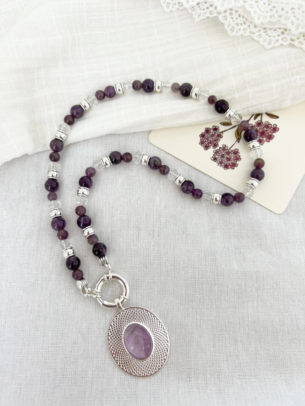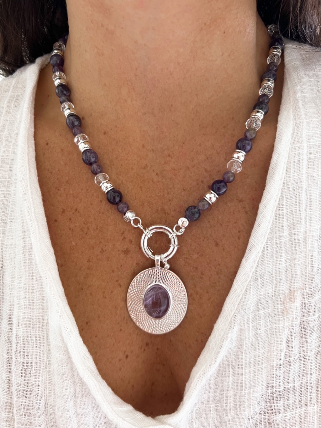 Collar elaborado con piedras naturales, cristales de roca y separadores de fundicion.Con cierre marinero y piedra cuarzo violeta engarzada en plata*.