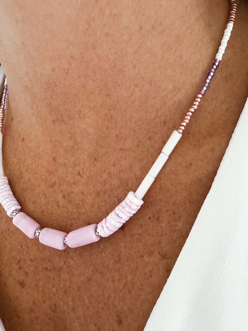Material: collar cort hecho con mostacillas checas, tubos de cerámica pintados y cadena de aluminio.