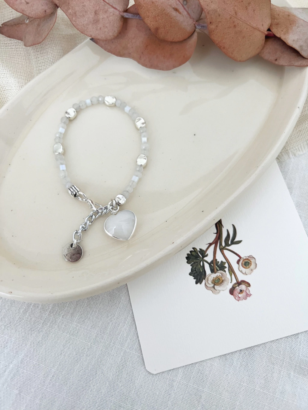 Pulsera regulable hecha de piedras naturales, cristales, separadores de fundicion y corazon de piedra natural.