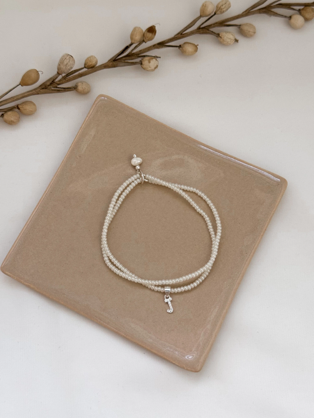 Pulsera elaborada con mostacillas checas perladas con inicial de strass y detalles en Plata 925 y Perlas de rio naturales. La medida es estandar, esta hecha con tanza elastica.